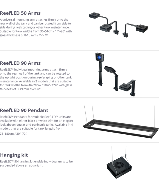 - Red Sea ReefLED 50 Mounting Arm: A sleek lighting solution for the ReefLED 50, allowing for optimal positioning and aesthetic integration above the aquarium.