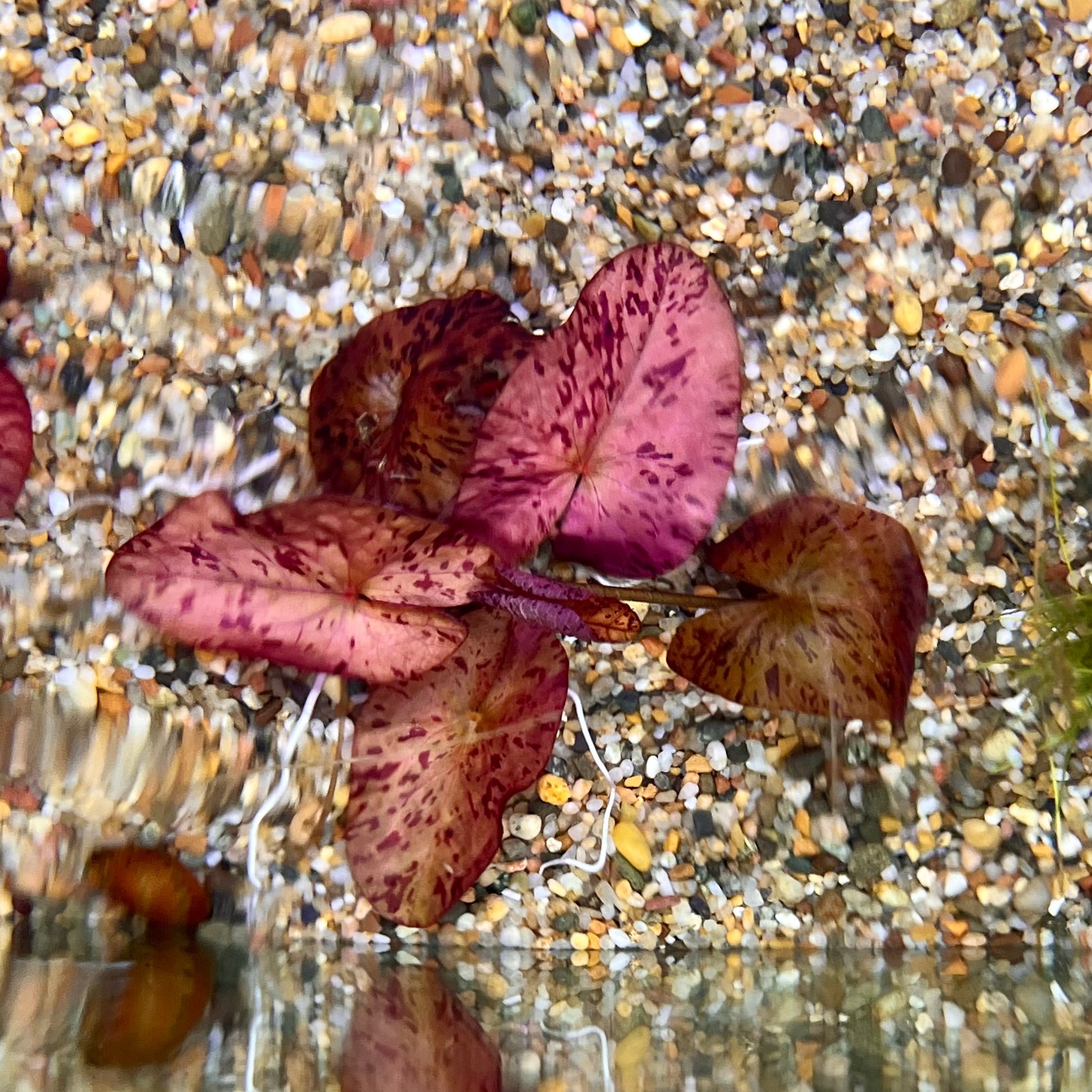 Intense red dappled leaves. Each plant comes with roots and bulb. Leaves will stretch to surface in low light and stay low and bright in high light. Can be grown in pond during warm weather months. (Item may not be exactly as pictured, but offers good representation of product.)